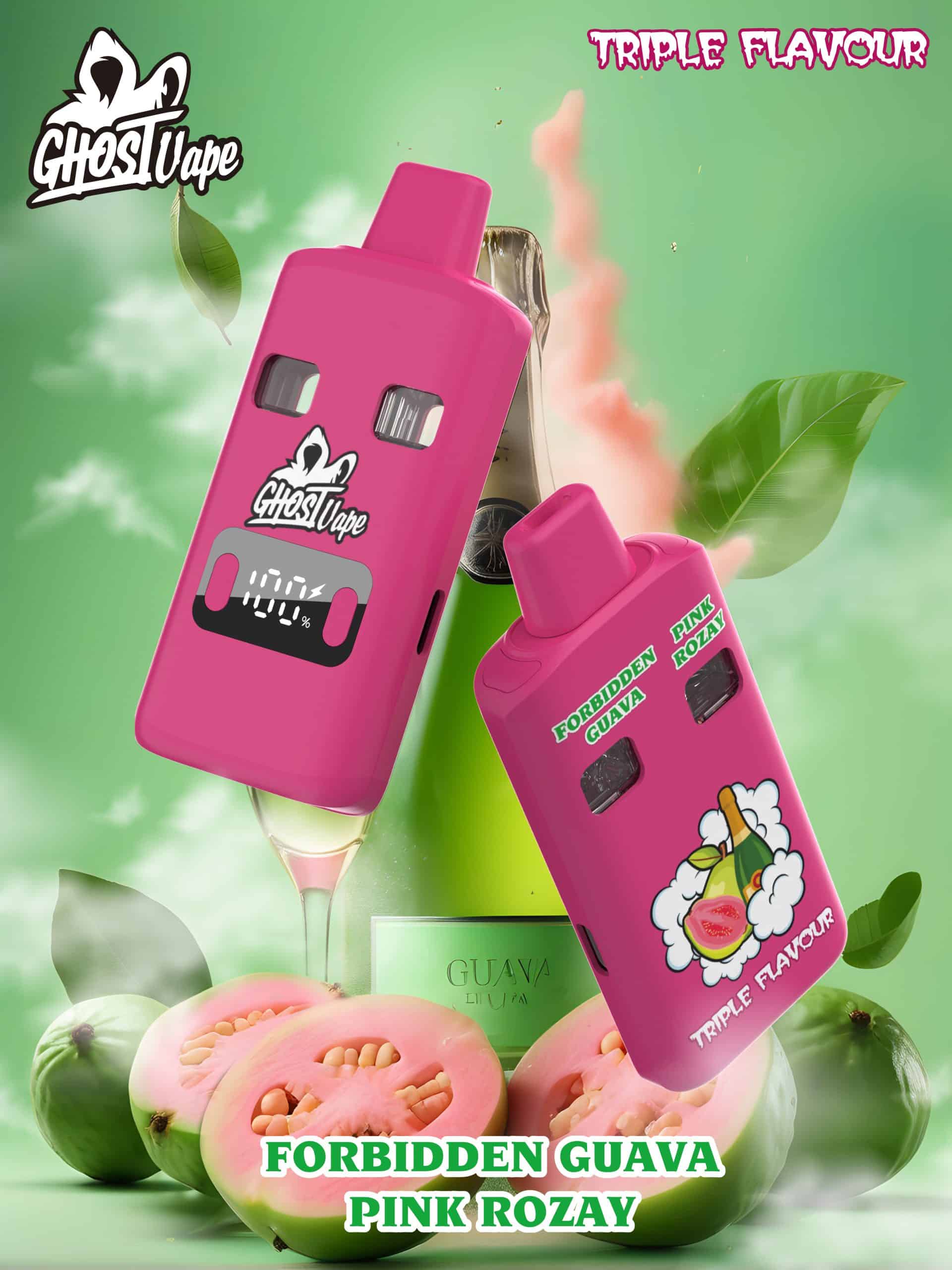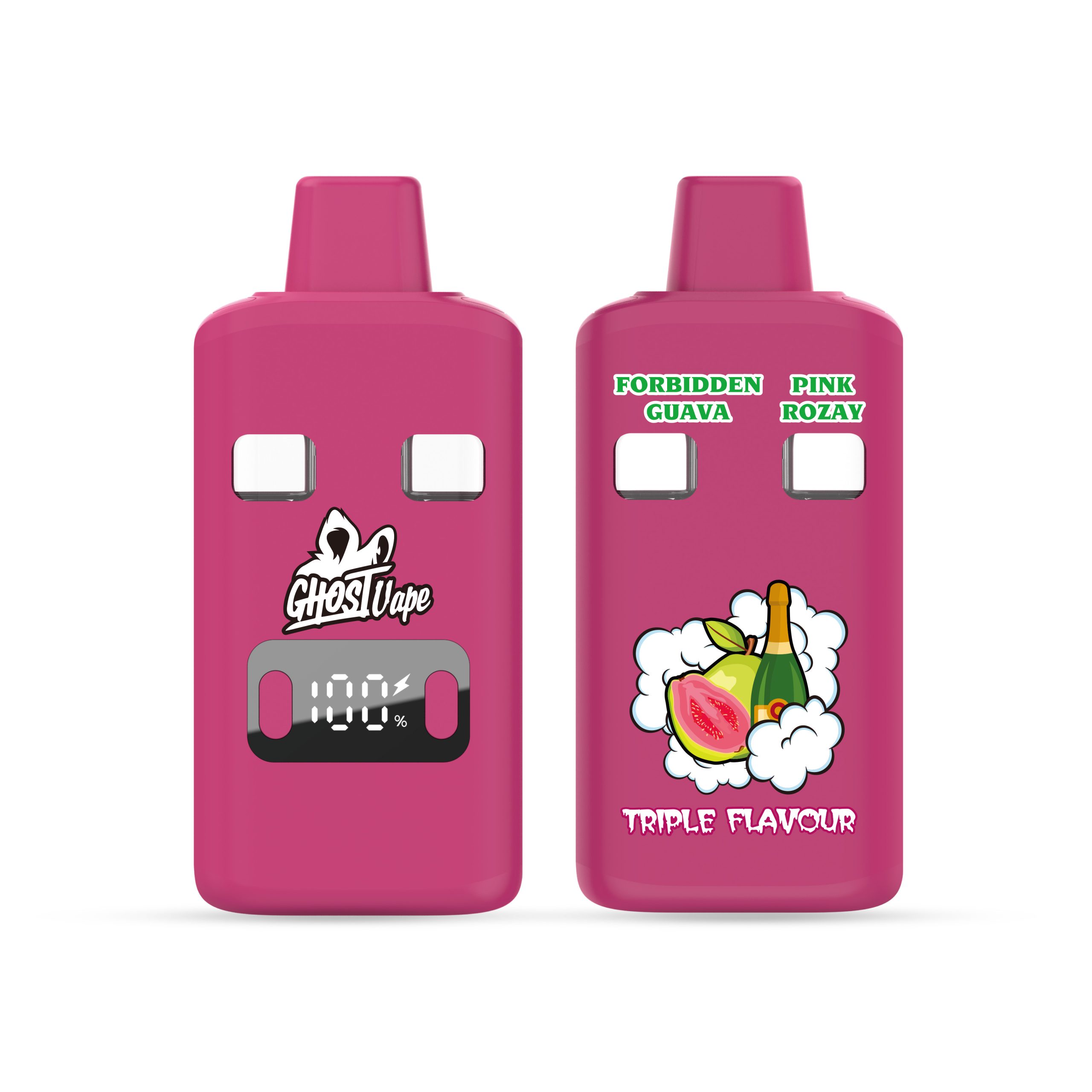 The Forbidden Guava x Pink Rozay THC Vape by Ghost Vapes delivers 2ml of premium Delta-9 distillate with 2000mg THC. This high-tech vape features an LCD screen for battery monitoring and the ability to switch between two exquisite flavors—or enjoy them both simultaneously for a triple-the-fun experience.