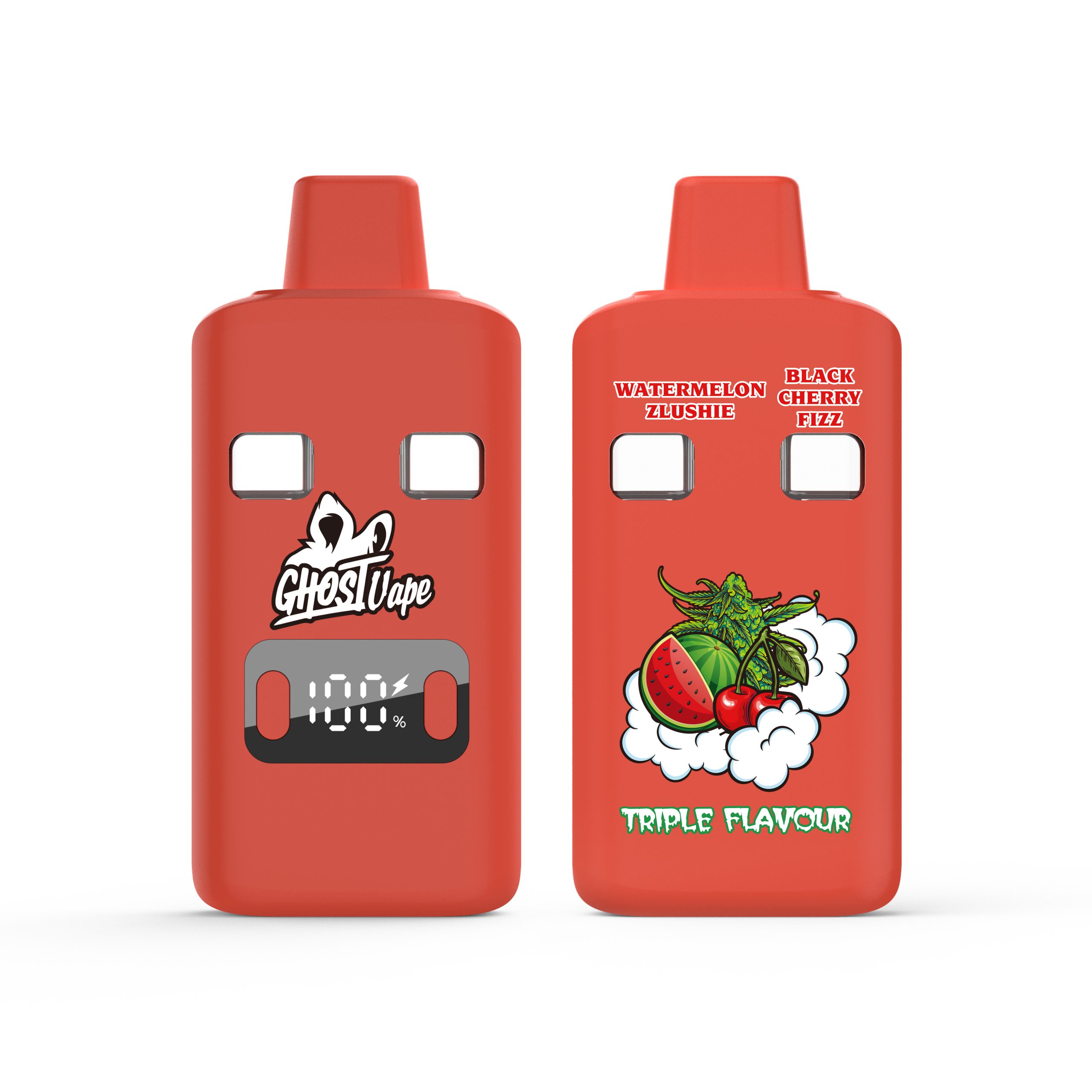 Elevate your vaping experience with Watermelon Zlushie X Black Cherry Fizz THC Vape by Ghost Vapes. This premium 2ml vape delivers 2000mg of Delta-9 distillate and features an advanced LCD screen to monitor battery life. Switch seamlessly between flavors, or mix both for a unique and powerful experience.