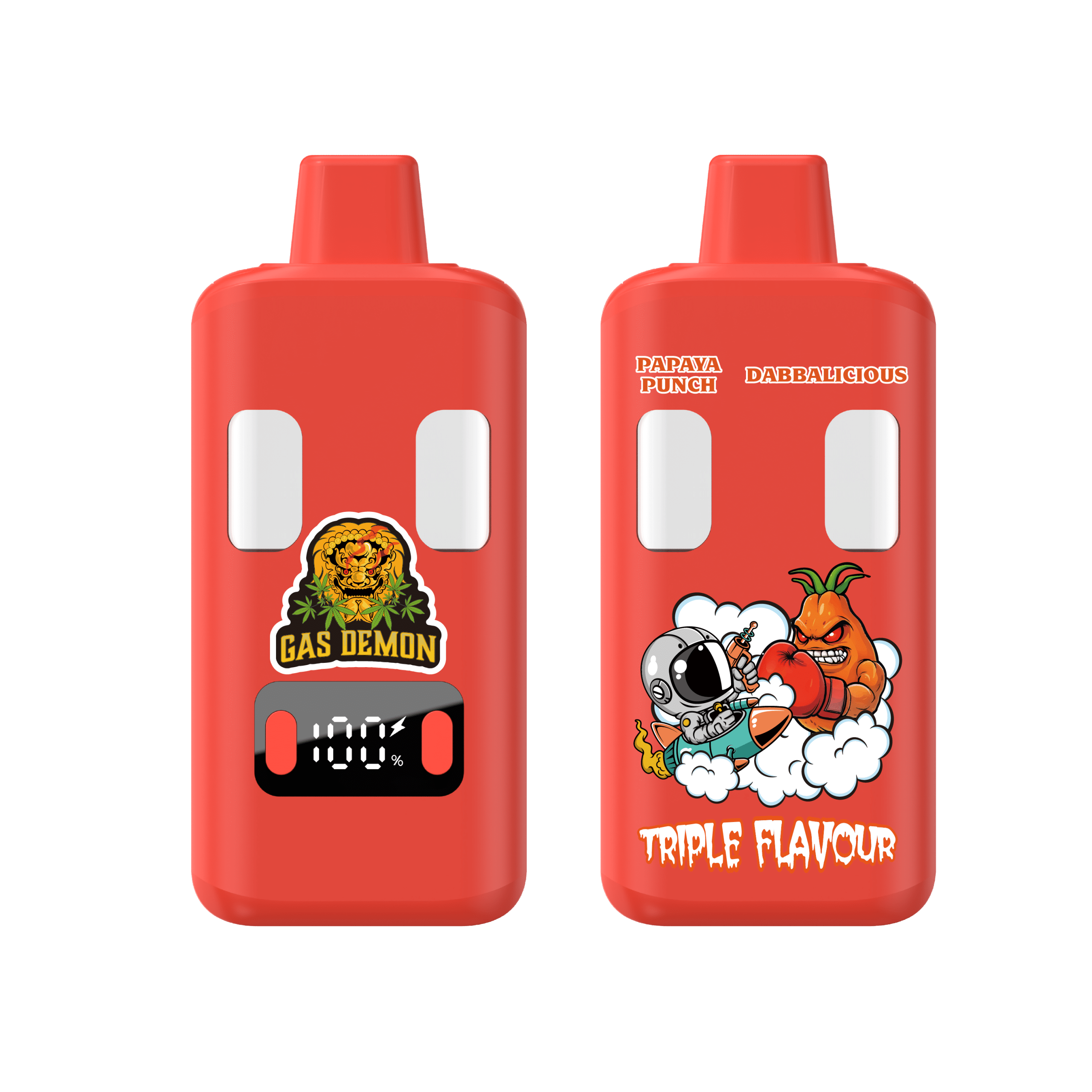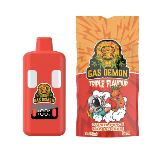 Experience the Vapes by Gas Demon Dual Flavor Delta-9 THC Vape Pen, a 6-gram premium device featuring 3g Papaya Punch and 3g Dabbalicious. This dual flavor THC vape lets you switch between tropical-sweet and dessert-rich flavors with a quick-slide inhaler. Enjoy smooth, potent hits with button-activated control, monitor your battery with the built-in LCD screen, and recharge fast with USB-C. Perfect for cannabis vape enthusiasts seeking flavor, potency, and versatility in one pen.
