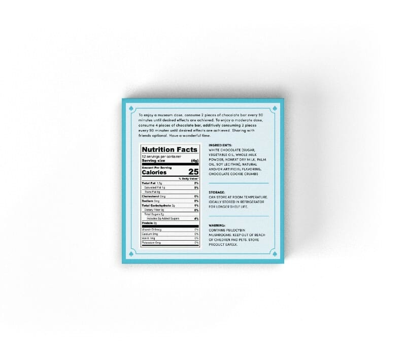 | Ingredients | Psilocybin, white chocolate (sugar, vegetable oil, whole milk powder, nonfat dry milk, palm oil, soy lecithin), natural and/or artificial flavouring, chocolate cookie crumbs. | |